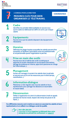 - Un questions-réponses adapté au télétravail en période de crise abordant la mise en place du télétravail ainsi que les conditions de travail en télétravail