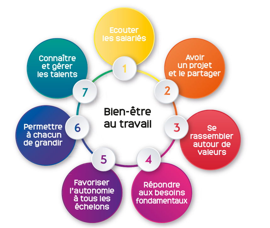 Après une présentation de la méthodologie, l’étude fait la synthèse de nombreux travaux portant sur le lien entre bien-être au travail et performance économique. Les chiffres sont là : le bien-être au travail diminue l’absentéisme et le turn-over, améliore l’engagement et favorise l’innovation. Au-delà du constat, quelles solutions ? Elles relèvent de chaque entreprise et reposent sur un cercle vertueux associant management et dialogue réalisée par Laure Brahami1. L’étude identifie sept clés pour le succès de la démarche :