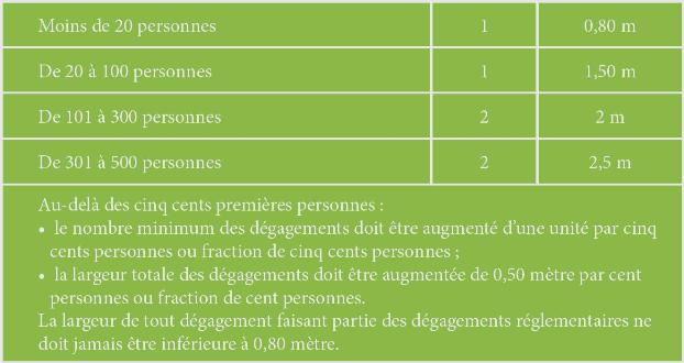 Article R4227-5 : Les locaux auxquels les travailleurs ont normalement accès sont desservis par des dégagements dont le nombre et la largeur exigibles s’établissent comme suit :